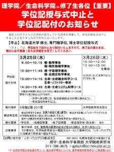 新型コロナウイルスの感染が拡大している現状を考慮して,「北海道大学 修士,専門職学位,博士学位記授与式」は中止することとなりましたのでお知らせいたします。