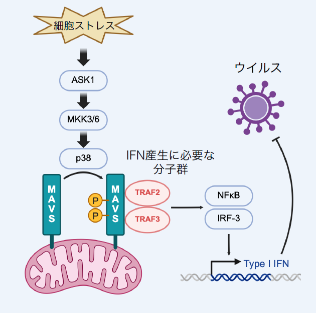 本研究では、ストレス応答に関わるASKファミリーに着目し、ASK1がp38 MAPKを介して、MAVSのリン酸化を誘導することを発見しました。さらに、このリン酸化が、IFN応答を選択的に増強する一方で、感染細胞のアポトーシスには影響を与えないことを明らかにしました。つまり、細胞ストレスはMAVSのリン酸化を介して、免疫応答の方向性を制御していることが示されました。