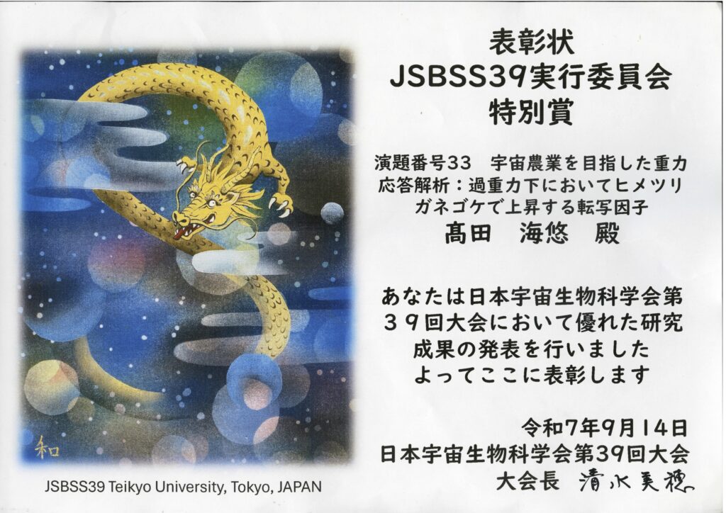 生命システム科学コース・細胞高次機能科学分野・植物進化発生制御研究室(藤田・楢本・Singh)に所属する大学院生、髙田海悠さんが、2025年度日本宇宙生物科学会第39回大会において、実行委員会特別賞を受賞しました。